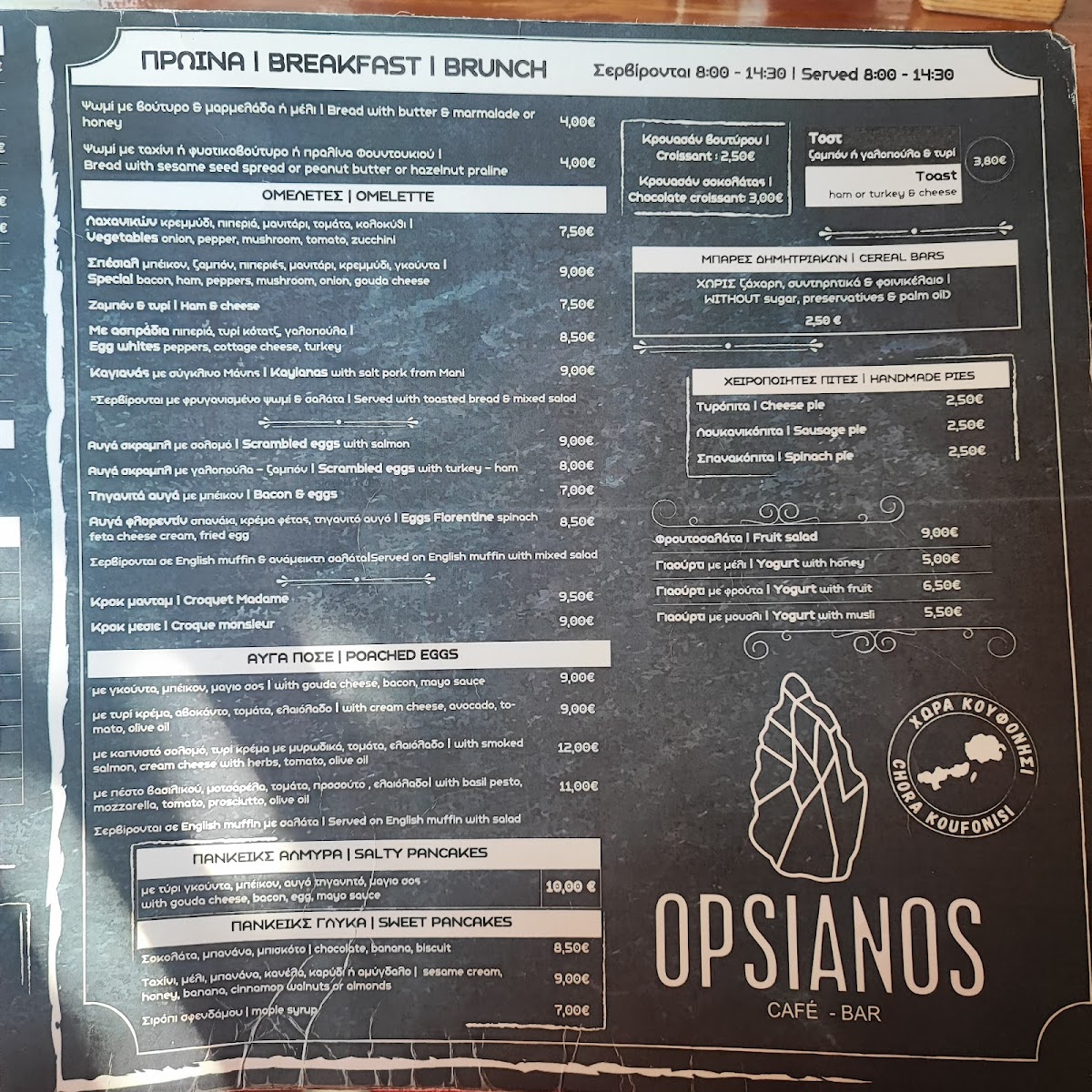 Welcome to Opsianos, a delightful breakfast spot located in the picturesque Koufonisia, Greece. This charming restaurant invites you to indulge in a menu that exudes quality and flavor, perfect for brunch enthusiasts. Guests rave about the salty pancakes topped with eggs and bacon, while others can't resist the club sandwich paired with crispy potato wedges, a true crowd-pleaser.
